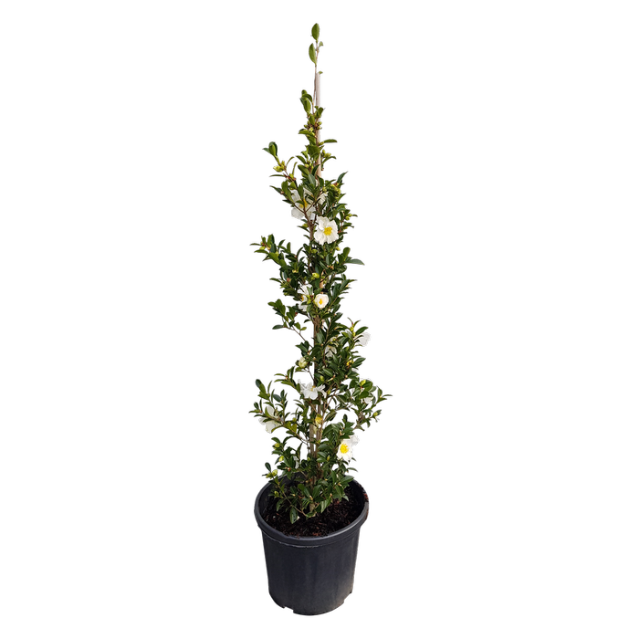 Dark green foliage, upright tidy habit and masses of large single white flowers with yellow stamens in early winter make this popular variety of Camellia a well proven favourite in gardens throughout New Zealand.