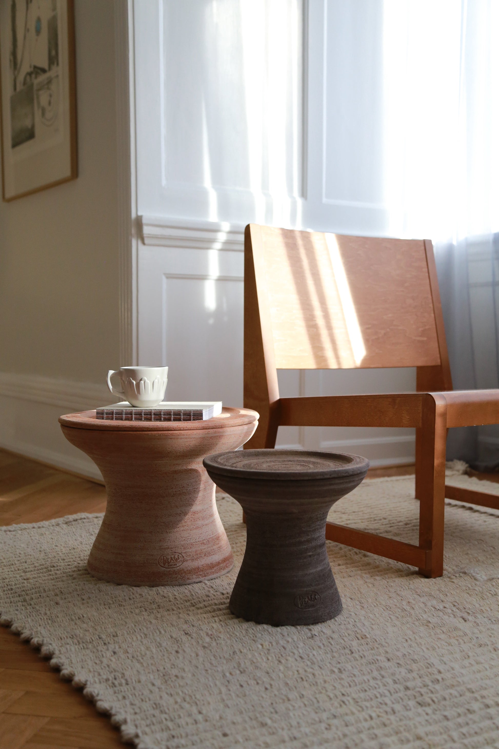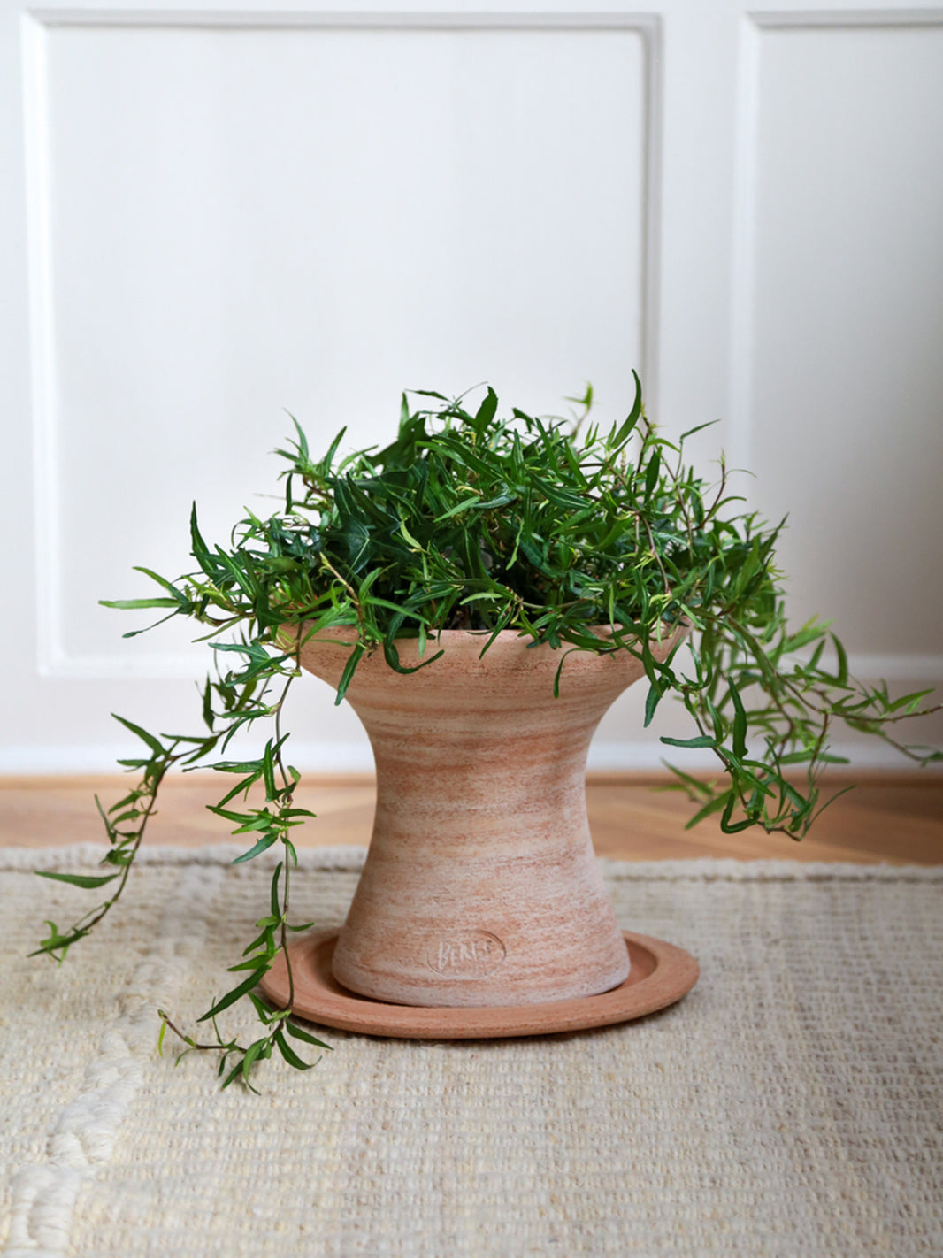 Handcrafted on the pottery wheel from premium terracotta, the waterproof saucer doubles as a lid to transform the set into a pedestal or side table.