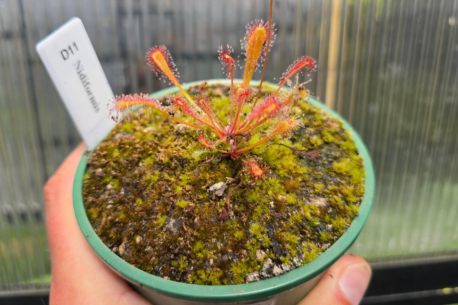 Drosera nidiformis is a tropical plant that originates from South Africa. Its unique features include long spoon-shaped leaves and tall flower scapes. This medium-sized plant showcases green leaves covered in red tentacles that shimmer beautifully. Its leaves have the ability to curl over their captured insects.