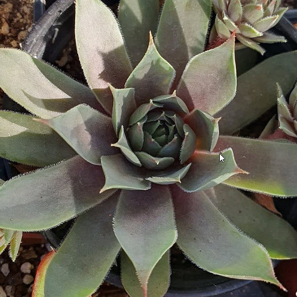 Foliage: The plant forms dense rosettes of short, fleshy, green leaves. The leaves are tipped with rosy-purple and lined with a fine fringe of hairs (cilia). The colors intensify with plenty of sunlight, turning a distinct violet in winter and coloring up nicely each spring.
