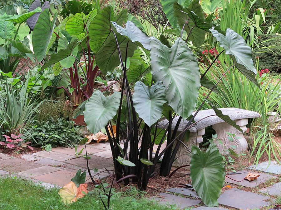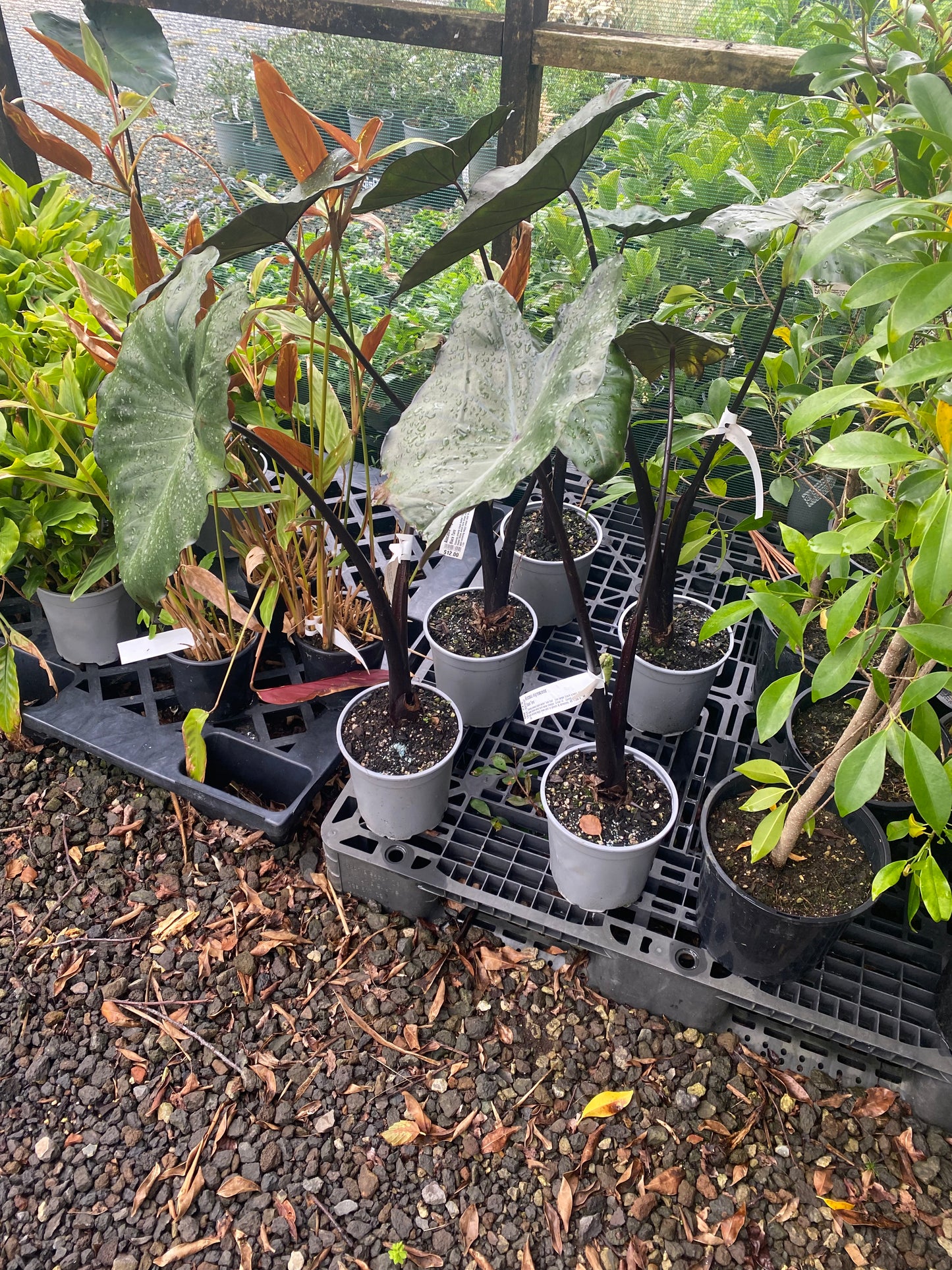 Colocasia fontanesii, also sold as Colocasia esculenta var. 'nigrescens' and Alocasia nigrescens is most commonly called 'Black Taro' and is a huge, striking, black stemmed Elephant Ear that grows tall stems and extra large leaves when given the right conditions; i.e wet and warm! Well placed clumps of this beauty will transport you to the humid tropics.