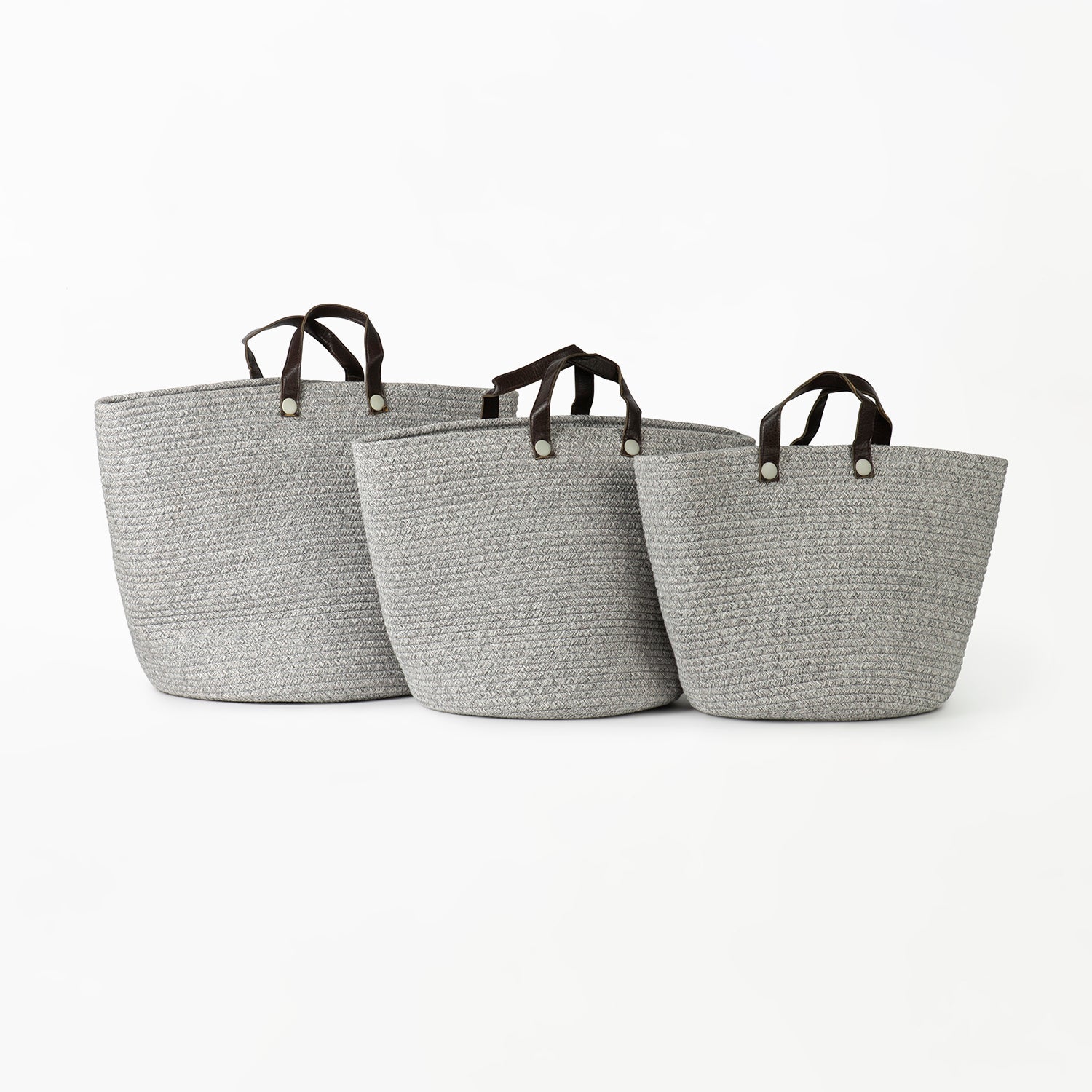 Our Grey coloured Cotton Basket can be used both as a Basket or as a Bag. It comes with with faux leather handles that make it easy to carry or move around. The soft texture of the cotton makes it perfect to use as storage around the house, especially in the kids bedroom to store toys. You can easily reshape this versatile basket into a bag and use it to carry your favourite things around. Choose from three different sizes to suit your needs perfectly. Take it to the markets to shop your fresh produce, use it to take flowers or wine to your dinner hosts or take it to work to carry your laptop around.