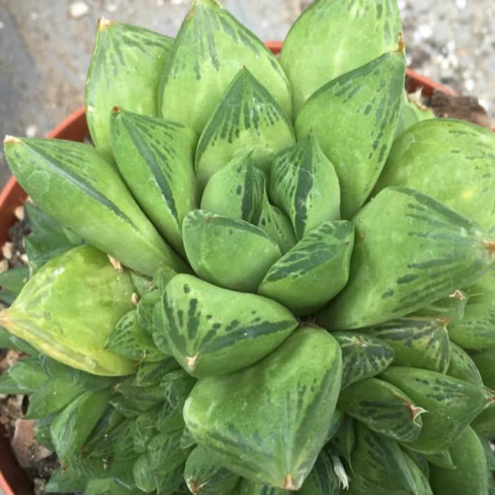 Haworthia cuspidata is a small succulent that forms rosettes of bright green leaves marked with darker green translucent areas near the apex. The rosettes can grow up to 4 inches (10 cm) in diameter and offset freely, forming a dense clump with age. The leaves are thick, fleshy, and pointed at the tips. They are shorter and thicker than those of Haworthia cymbiformis var. cymbiformis.