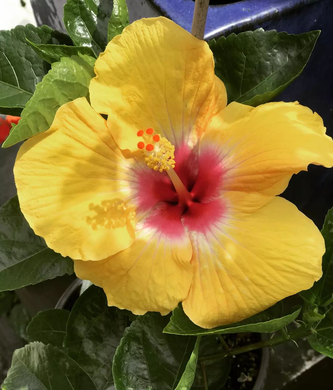 This gorgeous Hibiscus is an old Hawaiian variety that grows well in NZ. A medium single yellow flower with a deep pink eye with a white halo around it.