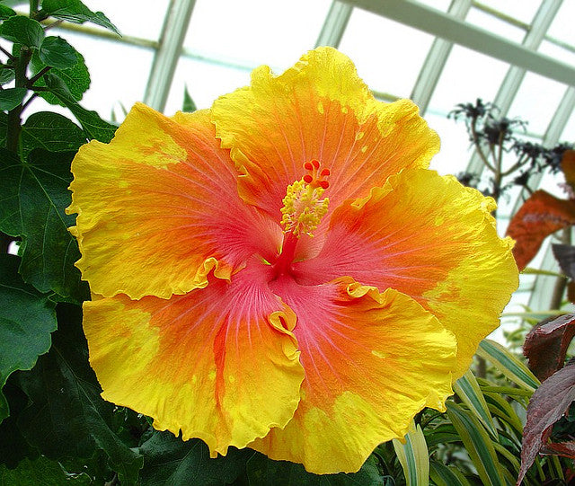 Hibiscus 'The Path' features huge, frilly-edged bold yellow round flowers with red eyes and rose streaks at the ends through summer and autumn. A showstopper.