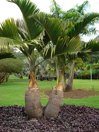 The Bottle Palm is a well-known and very popular ornamental for tropical and warm subtropical regions. It was once common on Mauritius in the Mascarene Islands but although commonly cultivated, its wild stands are reduced to a few handful of plants on tiny Round Island north of Mauritius. It produces a curiously swollen trunk, the shape of which is somewhat reminiscent of a champagne bottle. The crown holds up to five leathery, pinnate fronds supported by a slender, waxy crownshaft. The Bottle Palm grows fairly slowly but is a tough plant that can take drought and coastal conditions without a problem.