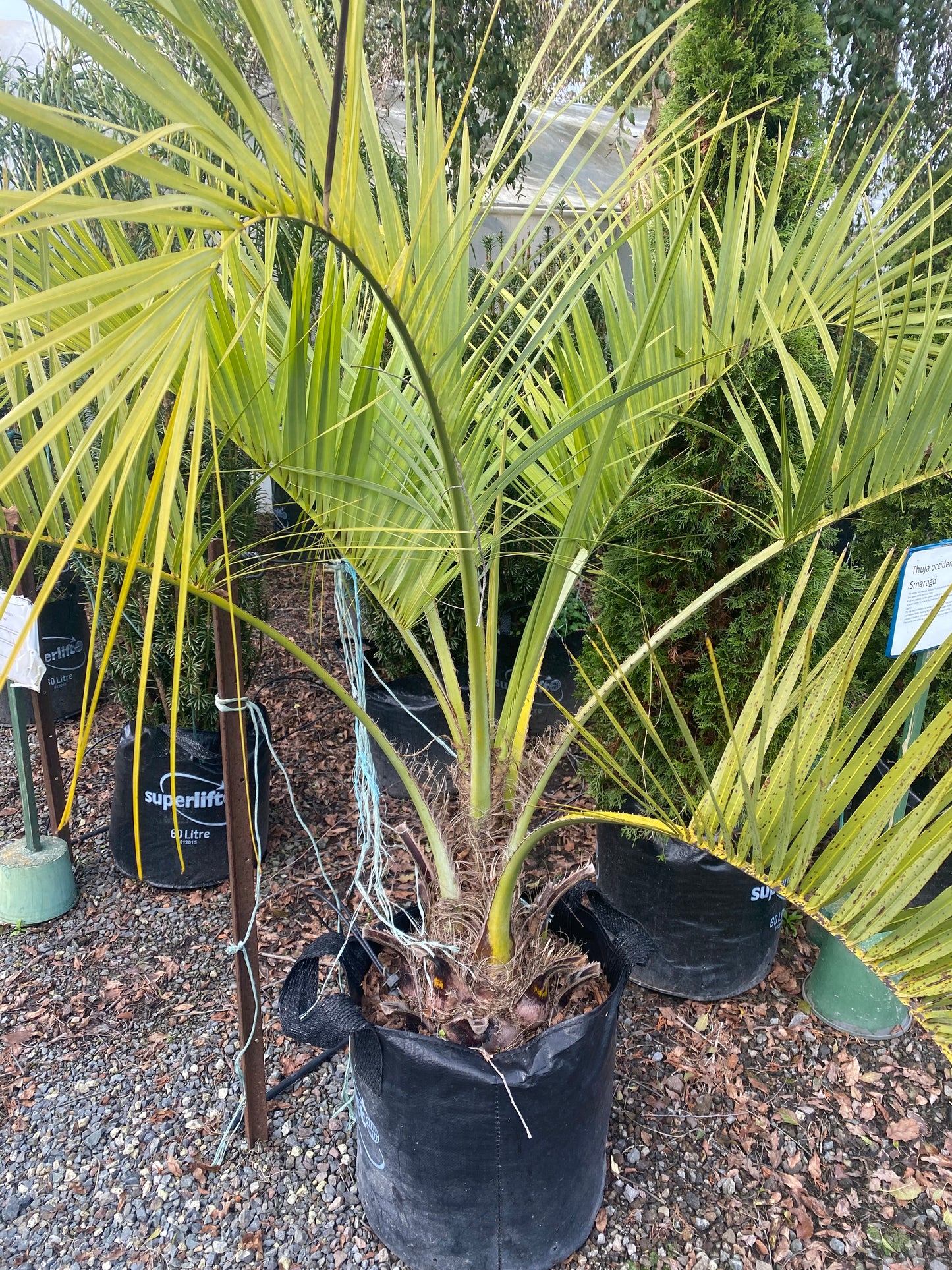 The lovely Jelly Palm (Butia capitata) has beautiful bluey-green foliage and is tolerant. of a wide range of conditions including, cold, wind and coastal conditions. A medium sized palm, it grows eventually to around 8m tall and not often much beyond that in NZ, and yet over time it does develop a most impressive stout, thick trunk. This fine looking palm that hails from Brazil in South America seems to enjoy NZ conditions.