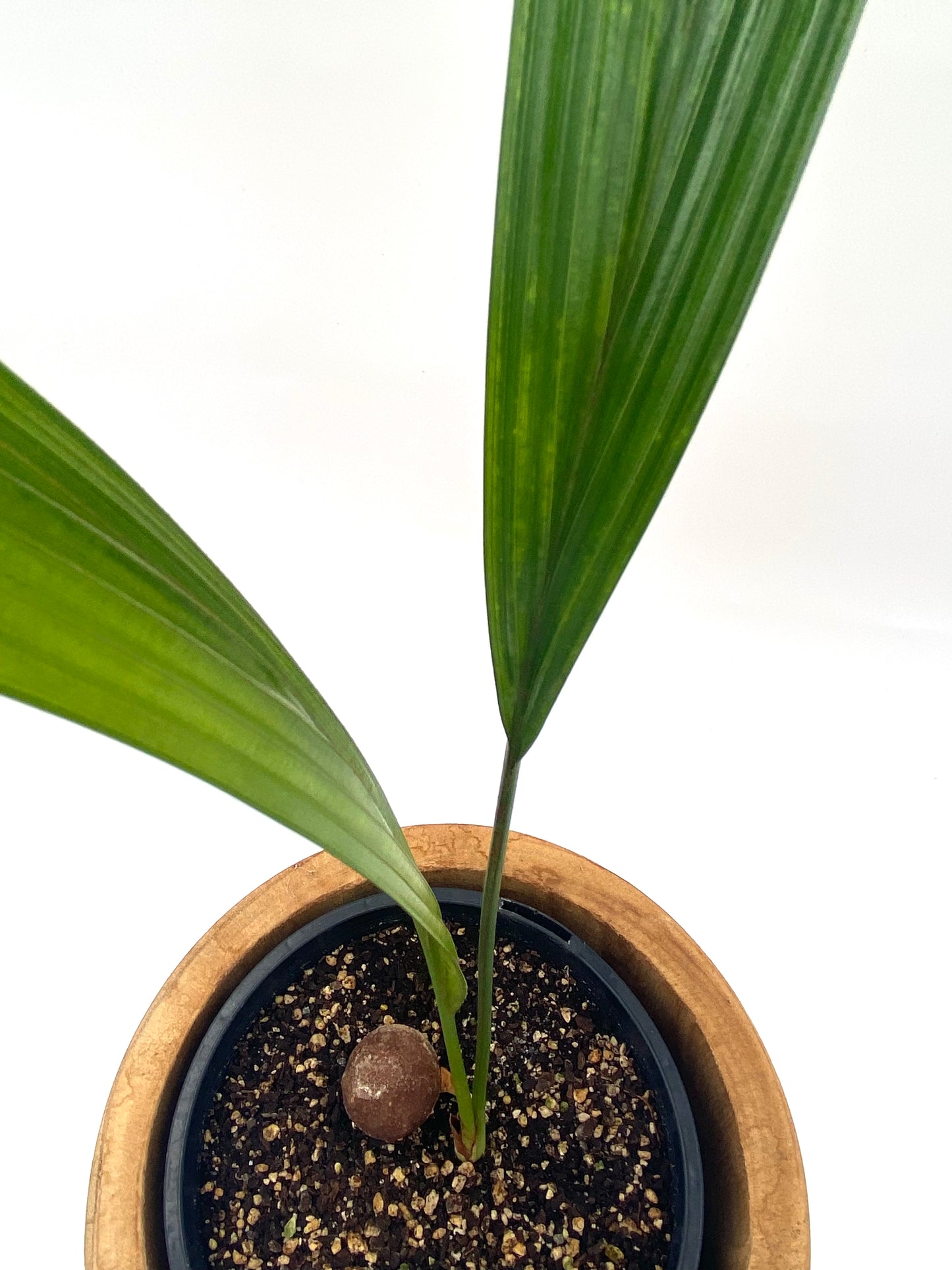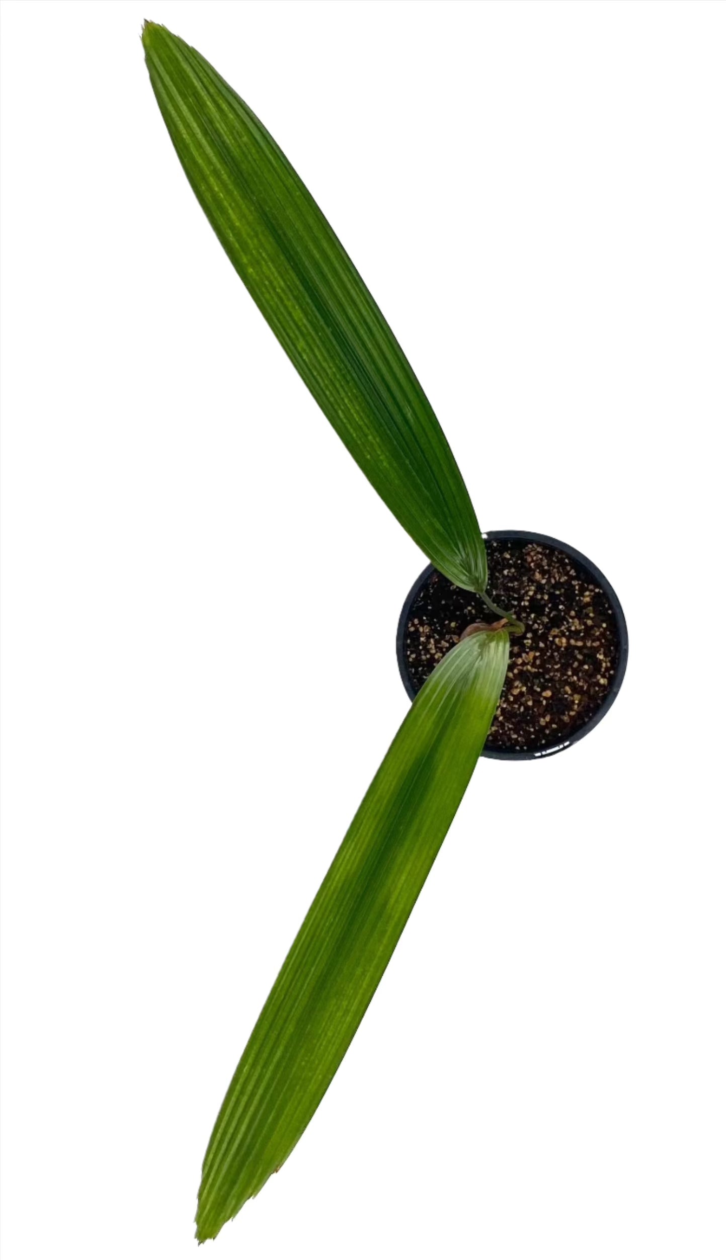 These large, simple (undivided) leathery, diamond-shaped leaves are pleated along their length, and have serrated edges. Famed for its unique undivided leaf shape, it's equally famous for being a slow grower, especially outside of the tropics. But patient believers will ultimately be rewarded with one of the most sought-after collector's palms the world over, as they are relatively happy growing indoors in containers, or if you're brave enough, established specimens planted outside are much hardier than you'd expect and will even tolerate light frost.