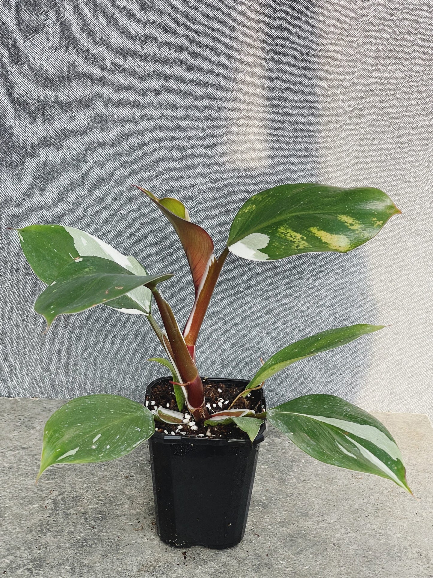 Philodendron White Princess has narrower leaves with green stems and small pink and white colouring