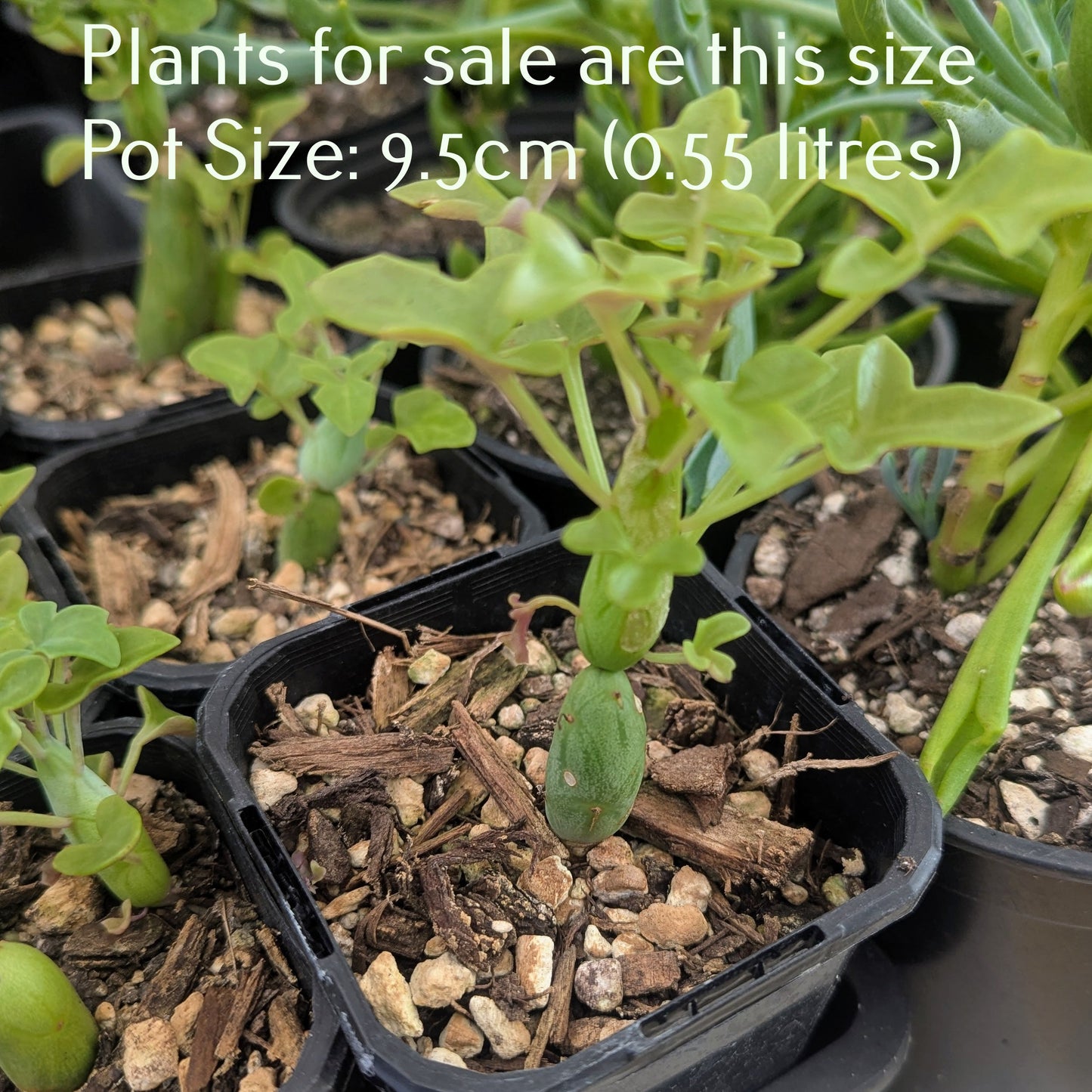 Baculellum articulatum, formerly known as Curio articulatus or Senecio articulatus, is an intriguing succulent with segmented, sausage-shaped stems. It can reach a height of 2 feet (60 cm) and spread slowly by underground stems. The stem segments are thick and fleshy and can grow up to 4 inches (10 cm) long and 0.8 inches (2 cm) in diameter. They are grey-green with darker green or purple markings just below the petioles. The leaves are green, flushed purple when exposed to intense light, usually divided into leaflets, and can measure up to 3.2 inches (8 cm) long. The plant loses its leaves and goes dormant in summer.