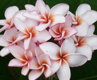 Plumeria Gee Petch, Gee Phet, Gee Pet, Jeepetch, aka 'Magenta Powder' has fabulous tight clusters of flowers that open pink, and quickly fade to a mostly white petal, with quite wonderful burnt-orange and reddish veins bursting from the centre.