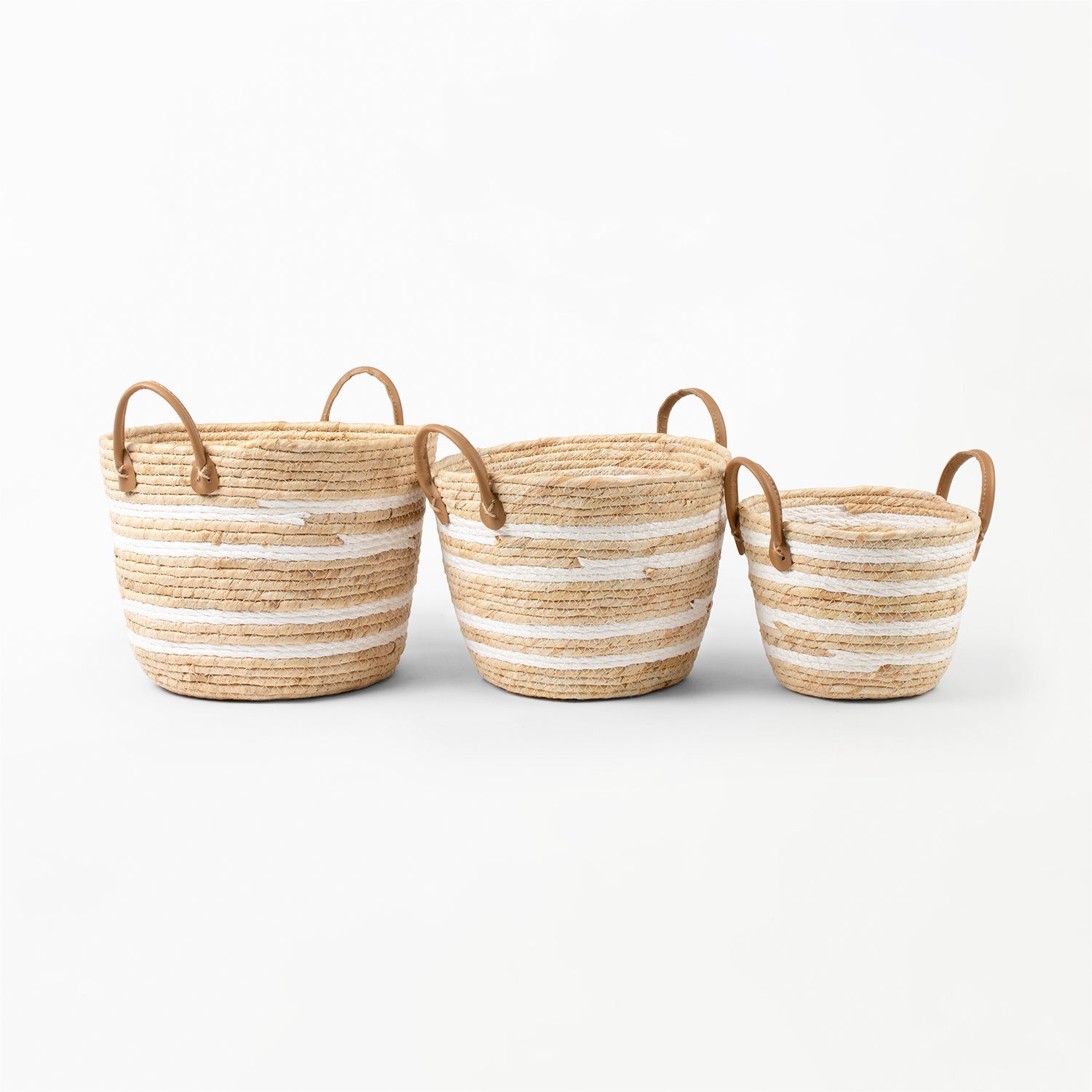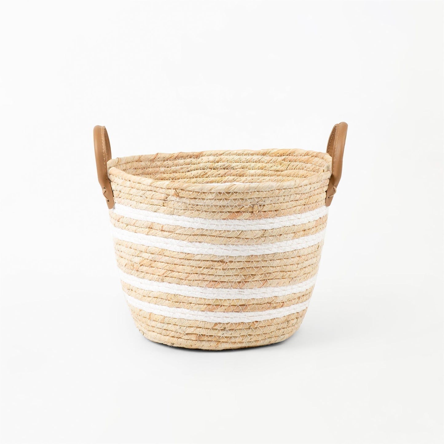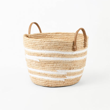 Add a touch of natural warmth to your home decor with our White Stripe Natural Woven Basket with Leather Handle.