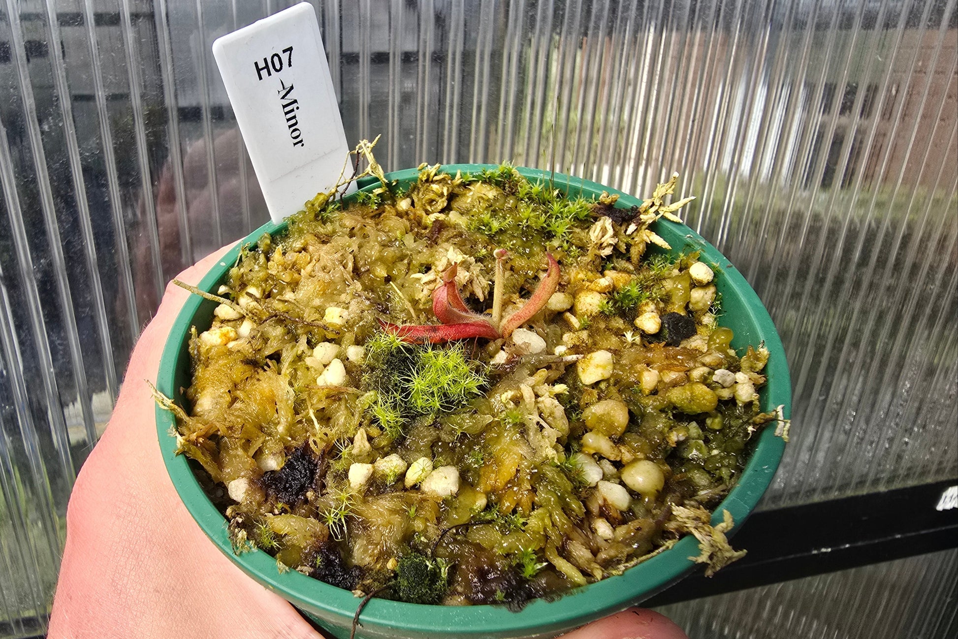Heliamphora minor, also known as the Lesser Sun Pitcher, is a compact plant with small, green urn-shaped pitchers with red tints. Its traps are sweetly fragrant, with small dark red nectar spoons. In full sun the traps can turn vibrant red. Additionally, they also form beautiful clumping colonies.